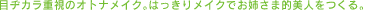 はっきりとした二重のモデルさんなので、濃い色をのせてもたいていは違和感なく作れます。ラインは上下ともに引き、上よりも下にしっかりと目頭からラインを引きます。そして、下まぶた目尻1/3のところにアイシャドウをぼかしこみます。下につけることで目を大きくみせる効果もあり、さらにマスカラを目に馴染ませてくれます。そして下まつげにもたっぷりマスカラをつけてください。