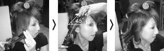 ![]() あらかじめホットカーラーを使って、トップの流れとボリュームをつけておきます。トップにはバックのボリュームをもってきたいので、頭の中心部、つまり耳上の延長からまっすぐ上から後方にかけて、大きな幅のカーラーを2本巻きます。このとき、フロント側は予め前髪がサイドに流れるようにブロースタイリングしておくとなお良いです。トップに分け目をつけないようにするためにもフロントに1本カーラーを巻きましょう。この時、欲しいボリュームによって巻き込む根元の角度を考えます。例えばボリュームが欲しい場合は床に対して90度〜60度くらい、欲しくない場合は45度〜30度くらいが目安です。